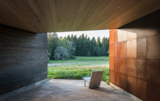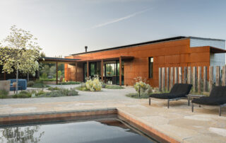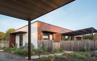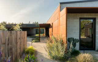 Using traditional rural materials of rusted metal, concrete and darkened wood helps the home to blend and recede into the landscape